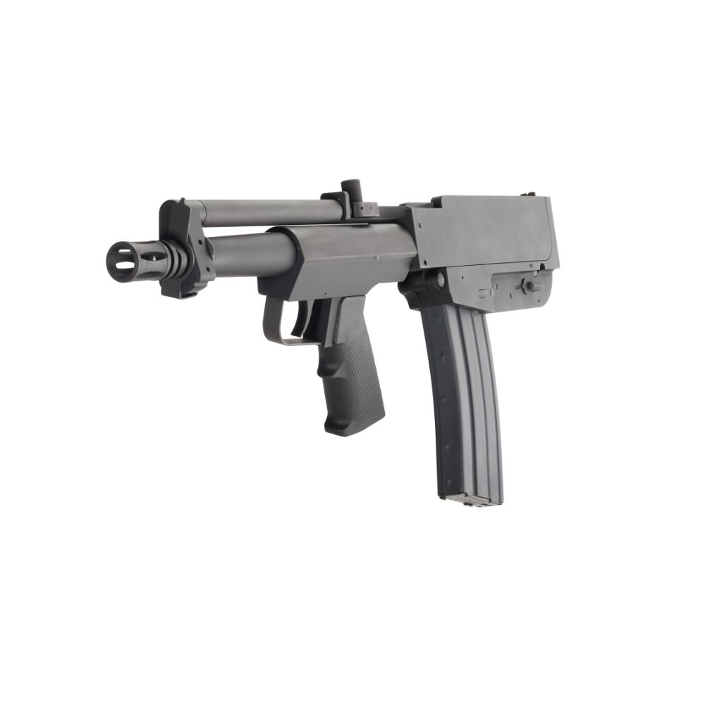 The BMP-23 pistol is a reborn Gwinn Firearms design Bushmaster arm pistol from the early 1970’s. It’s 5.56 caliber with an 11.5″ barrel and AK-47 type gas piston operating system. This lightweight aluminum and steel design weighs in at 5.2 Lbs and has built in iron sights. There’s also a unique 40-degree swivel design for right- and left-hand use.