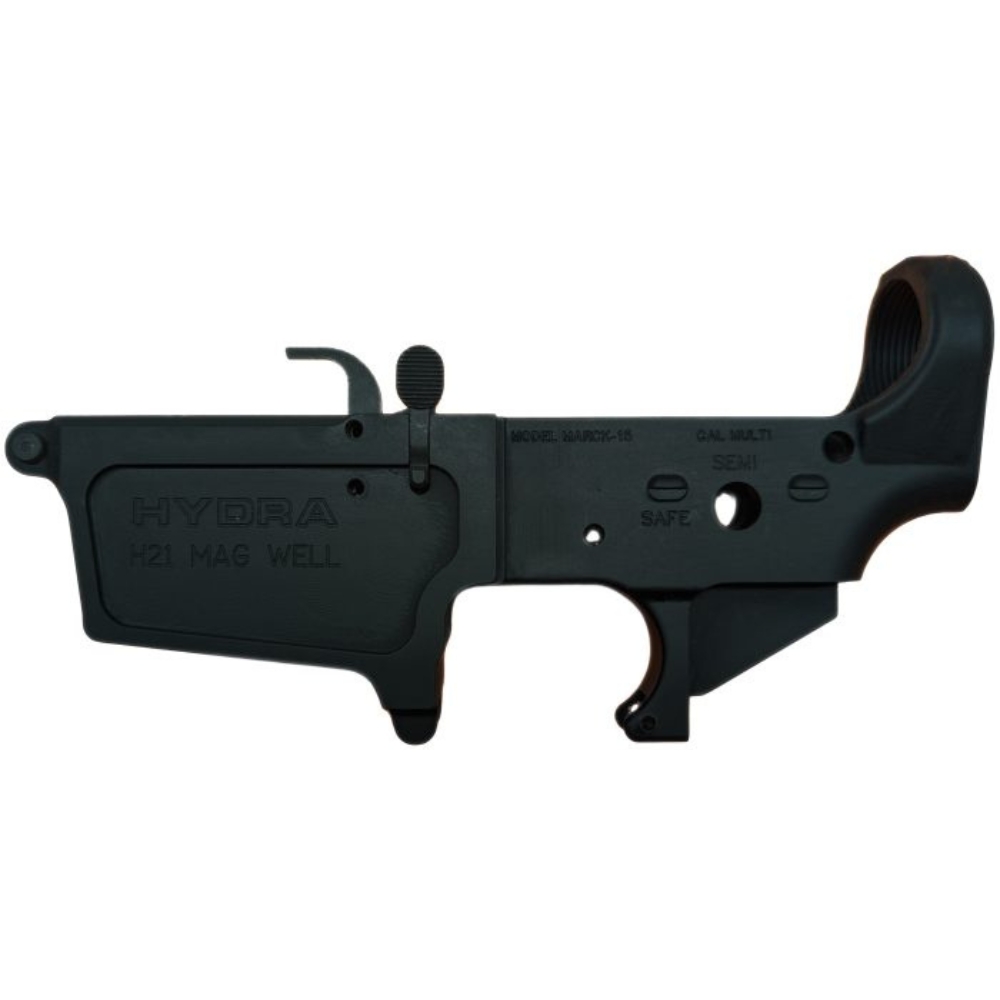 This Hydra Stripped Modular Lower comes with a 45acp/10mm H21(Glock Style) Interchangeable Magazine Well and offers the ability to change Magazine Wells on your Lower Receiver to accommodate whatever caliber you want. Leaving it as a Stripped Lower allows any AR-15 Mil-Spec Stock and Fire Control Group (FCG) to make it complete. Ideally suited for use with the Hydra® Quick Change Barrel Upper Receiver (QCB-D), where you can change calibers by switching out barrels as well. This is a Stripped Modular Lower Receiver and only includes H21 (Glock Style) Interchangeable Magazine Well.